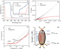 | Fig. 4. (a) UV–vis DRS and Tauc curves of ZnO, ZIF-8 and ZnO@ZIF-8. (b) Nyquist plots of ZnO and ZnO@ZIF-8. (c) Mott-Schottky plots of ZnO and ZnO@ZIF-8. (d) Energy band structures of ZnO (in blue) and ZnO@ZIF-8 (in red). For interpretation of the references to color in this figure legend, the reader is referred to the web version of this article. | |