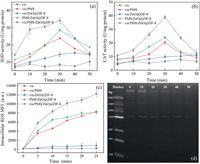 | Fig. 7. (a) Bacterial SOD activity; (b) bacterial CAT activity; (c) Intracellular ROS levels of different bacteria inactivation systems; (d) DNA agarose gel electrophoresis of E. coli in vis/PMS/ZnO@ZIF-8 system. Experimental conditions: T = 25 ℃; [ZnO@ZIF-8] = 100 mg/L; [PMS] = 0.05 mmol/L; pH0 = 6.5; λ ≥ 400 nm. | |