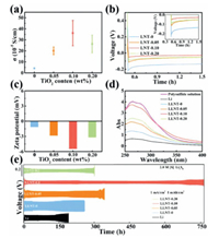| Fig. 2. (a) Lithium-ionic conductivity and (b) lithium-ionic nucleation overpotential of Nafion/TiO2 film with different contents of TiO2. Zeta potentials of (c) different protective films and (d) UV–vis absorption spectra of different protective films. (e) Cycling life of symmetric cells with different electrodes in Li2S8 electrolyte at the current density of 1 mA/cm2 and capacity density of 1 mAh/cm2. | |