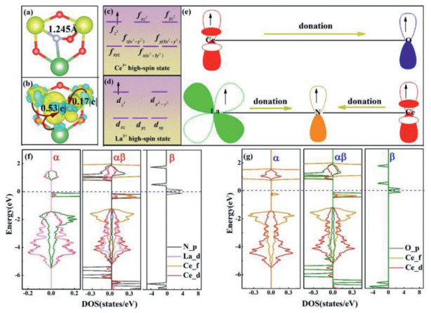 For the interaction between the two main states of 4f-5d for Ce3+ atom and O2p states for O atoms, we present in Figs. 3c, e and g that the energy levels of Ce3+ majority f spin states involved in the interaction with p-spin orbitals of O atom with the energy of αβ-states lower which becoming more stable. Obviously, the fx3 orbitals electrons are donated to the O2p orbitals, which proving up to the hilt that surface generated an OV possess the capability of redox. Also, for interaction between Ce3+, La2+ and O atoms, we present in Figs. 3d–f the spin densities are strongly localized on Ce4f, 5d, La5d and 2p of N states, the energy levels of Ce3+ majority 4f spin states and La2+ 5d-states involved in the interaction with 2p-spin orbitals of N atom with the energy of αβ-states lower which becoming more stable, too. Similarly, as our previous analysis, the 4fx3 orbitals of Ce and 5dz3 orbitals of La electrons are donated to the 2p orbitals of N indicates that surface-anchored La also owns the capability of redox.