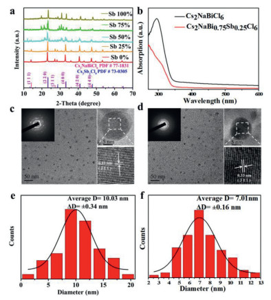| Fig. 1. (a) XRD patterns of Cs2NaBi1-xSbxCl6 (x = 0, 0.25, 0.5, 0.75, 1). (b) Steady-state absorption spectra of Cs2NaBiCl6 and Cs2NaBi0.75Sb0.25Cl6. (c, d) Low-resolution TEM images of Cs2NaBiCl6 and Cs2NaBi0.75Sb0.25Cl6 NCs (insets: electron diffraction patterns and associated HRTEM images). (e, f) The size distributions of Cs2NaBiCl6 and Cs2NaBi0.75Sb0.25Cl6 NCs. | |