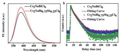 | Fig. 2. (a) PL spectra of Cs2NaBiCl6 and Cs2NaBi0.75Sb0.25Cl6 NCs. (b) Time-resolved PL traces of Cs2NaBiCl6 and Cs2NaBi0.75Sb0.25Cl6 NCs measured with TCSPC. | |
