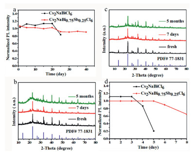 | Fig. 3. (a) The percentages of PL intensity of Cs2NaBiCl6 (3.4 mg/mL) and Cs2NaBi0.75Sb0.25Cl6 (2.3 mg/mL) solutions at different times when exposed to air. The XRD patterns of (b) Cs2NaBi0.75Sb0.25Cl6 powder and (c) Cs2NaBiCl6 powder after 7 days and 5 months being placed in the air. (d) The percentages of PL intensity at different times when 3% water were added to 5 mL supernatant of two NCs. | |