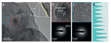 | Fig. 1. (a) TEM images of CQDs10@NiFe-MOF-A, inset in (a): enlarged TEM image of the boundary. (b, c) High-resolution TEM images and corresponding SAED in (a). (d) Contrast intensity profile of (b). | |