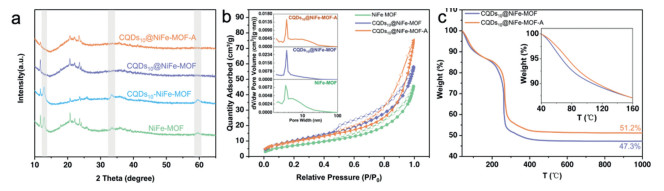 Thermogravimetric analysis (TGA) was measured from 40 ℃ to 1000 ℃ under oxygen atmosphere to verify the successful implementation of the low-temperature calcination. The curves in Fig. 2c told us that the CQDs10@NiFe-MOF-A had a slight advantage in thermostability over the uncalcined counterpart, which was reflected by its slower falling curve and more residual weight after TGA test. This was resulted of the simple short-time calcination treatment at 160 ℃ during the fabrication of CQDs10@NiFe-MOF-A. Thus, the CQDs10@NiFe-MOF-A exhibited a delayed decline in weight loss from the initial temperature to about 160℃ (inset in Fig. 2c), owning to the partial loss of lattice water, and a more-defective catalyst and enhancement in catalytic performance can be expected.
