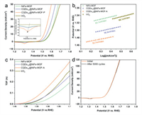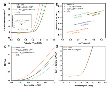 | Fig. 3. OER performances. (a) LSV OER polarization curves of the catalysts without iR-correction, inset: enlarged curves at around 1.3 V (vs. RHE). (b) Corresponding Tafel slope and (c) TOF in (a). (d) Polarization curves of CQDs10@NiFe-MOF-A at the 1st and 5000th cycle for OER. | |