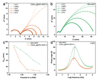 | Fig. 4. EIS performances of NiFe-MOF and CQDs10@NiFe-MOF-A. Nyquist plots of (a) CQDs10@NiFe-MOF-A and (b) NiFe-MOF at different applied potentials (vs. RHE). (c) Total charge transfer resistance (Rtotal) at the different applied potentials. (d) Bode phase plots at 1.52 V (vs. RHE). | |