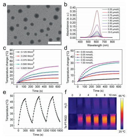 | Fig. 1. (a) Transmission electron microscope image of Ts-PT-RGD nanoparticles. Scale bar is 200 nm. (b) UV-vis absorption spectra of Ts-PT-RGD with different concentrations. (c) Time-dependent temperature changes of Ts-PT-RGD (0.5 mmol/L) at different power densities under irradiation of 635 nm laser. (d) Time-dependent temperature changes of Ts-PT-RGD at different concentrations under irradiation of 635 nm laser (0.5 W/cm2). (e) Temperature cycling curves of Ts-PT-RGD (0.5 mmol/L) over three on-off cycles of 635 nm laser (0.5 W/cm2) irradiation. (f) Thermal images of Ts-PT-RGD (0.5 mmol/L) under 635 nm laser (0.5 W/cm2) irradiation for 10 min. | |