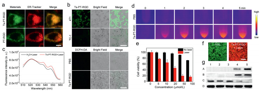 | Fig. 2. (a) The location of Ts-PT-RGD and PT-RGD with ER. Scale bar is 7.5 µm. (b) CLSM images of 4T1 and TC-1 cells treated with Ts-PT-RGD. Scale bar is 100 µm. (c) The fluorescence intensity of 2′, 7′-dichlorofluorescin diacetate (DCFH) solutions with different treatments. And CLSM images of 4T1 cells treated under different conditions to evaluate ROS production based on Reactive Oxygen Species Assay Kit (DCFH-DA) fluorescence intensity. Scale bar is 100 µm. (d) Thermal image of 4T1 cells incubated with Ts-PT-RGD (50 µmol/L) or PBS under 635 nm laser irradiation (0.5 W/cm2) for 5 min. (e) MTT assays of 4T1 cells with different concentrations of Ts-PT-RGD with or without laser (n = 3). (f) Live/dead cell staining assays of 4T1 cells with different treatments. Scale bar is 100 µm. (g) Western blot analysis of caspase-3 and CHOP proteins expressed in 4T1 cells after treatment with 1 (PBS), 2 (Laser), 3 (Ts-PT-RGD, 50 µmol/L), 4 (PT-RGD+Laser, 50 µmol/L), and 5 (Ts-PT-RGD+Laser, 50 µmol/L) for 8 h. A: CHOP; B: Cleaved-caspase-3; C: Pro-caspase-3; D: GAPDH. Laser power: 0.5 W/cm2, 5 min. | |