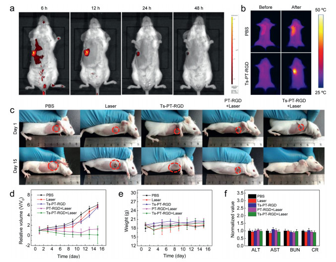 | Fig. 3. (a) Fluorescence imaging at different time points of 4T1 tumor bearing mice after intravenous injection of Ts-PT-RGD (0.5 mmol/L). (b) Thermal images of 4T1 tumor bearing mice after intravenous injection of Ts-PT-RGD (0.5 mmol/L) or PBS under 635 nm laser (0.5 W/cm2) irradiation for 10 min. (c) Pictures of different groups mice on day 1/15 after different treatments. (d) Relative tumor volume curves, (e) Body weight change curves and (f) blood biochemistry analysis of different groups mice after different treatments (n = 3). ALT: alanine aminotransfease; AST: aspartate aminotransferase; BUN: blood urea nitrogen; CR: creatinine | |