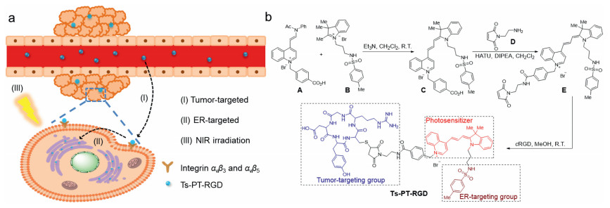 | Scheme 1. (a) The target and treatment principle of Ts-PT-RGD. (b) Synthesis of Ts-PT-RGD. HATU: 2-(7-aza-1H-benzotriazole-1-yl)-1, 1, 3, 3-tetramethyluronium hexafluorophosphate; DIPEA: N, N-diisopropylethylamine. | |