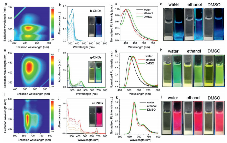 | Fig. 3. (a) Excitation-emission contour plots of the b-CNDs. (b) UV-vis absorption spectra of the b-CNDs. The insets are the images of CNDs under sunlight and 365 nm excitation. (c) The PL spectra of modified b-CNDs are dispersed in water, ethanol and DMSO, and (d) the corresponding images under sunlight and 365 nm excitation. (e) Excitation-emission contour plots of the g-CNDs. (f) UV-vis absorption spectra of the g-CNDs. (g) PL spectra of g-CNDs dispersed in different solvents. (h) Image of g-CNDs dispersed in different solvents. (i) Excitation-emission contour plots of the r-CNDs. (j) UV-vis absorption spectra of the r-CNDs. (k) PL spectra of r-CNDs dispersed in different solvents. (l) Image of r-CNDs dispersed in different solvents. | |