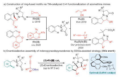 In terms of the high efficiency and good atom-/step-economy, transition metal (TM)-catalyzed C-H functionalization strategy has been demonstrated as a practical protocol in synthetic chemistry [1-3]. Up to date, diversified directing groups (DGs) and coupling partners (CPs) have been developed to achieve challenging reaction modes in this field [4-11]. On the other hand, the cascade reaction involving multiple new bonds formation via a simple one-pot operation has drawn continuous interest due to its superiority in assembling complex molecules, consequently, the combination of TM-catalyzed C-H functionalization and the cascade strategy has been proven to be a powerful approach for the rapid synthesis of polycyclic ring-fused motifs [12-18]. Azomethine imines, equipped with a dipolar fragment, had been developed as versatile reactants to participate in diverse C-H functionalization/dipolar cycloaddition cascades, which provided reliable synthetic methods to afford various ring-fused skeletons (Scheme 1a) [19-24]. Despite these remarkable advances, there is still room for improvement, e.g., developing novel reaction manifold and realizing asymmetric synthesis of intriguing complex structures.