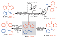 To our delight, anthrones bearing hydroxyl groups (anthralin) and chlorines proceeded smoothly under the standard reaction conditions (Scheme 3). The reactivity of anthralin also favoured carbon over oxygen attack, providing the benzylic functionalization product 3ab in 52% yields with 90% ee. Electron rich and electron deficient aryl propargylic esters proceeded smoothly under the standard reaction conditions, generating the desired products 3hb-3ib in good yields with good to excellent enantioselectivities. Again, aliphatic propargylic ester was the suitable substrate (3mb). Interestingly, the reaction with 1,8-dichloroanthrone and 4,5-dichloroanthrone gave the corresponding products 3ac and 3ad in 46% and 86% yield with 86% and 80% ee, respectively. Additionally, unsymmetrical anthrone 1,5-dichloroanthrone 2e was also performed to deliver 3ae with moderate diastereoselectivity of 2.5:1 d.r. in 85% yield with 82%/98% ee.