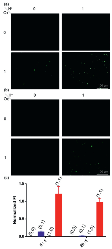 Supramolecular complexation is a strategy to construct complex systems with simple building blocks [11–20]. To this date, it is challenging to develop supramolecular logic gates, which are operational in the complex biological environment. Researchers are interested in special physiological and pathological conditions, which are crucial for diagnostic and therapeutic uses. Mildly acidic condition and reactive oxygen species (ROSs) are two important biomarker signals. ROS is existing in tumor and inflammatory tissues [21,22]. Mildly acidic condition is often found in tumor extracellular environment or endosomal compartments [23]. Molecular or nanoscale structures responsive to acidic pH, ROS or other biomarker signals are valuable for disease diagnostics or the targeted delivery of pharmaceutical drugs [24,25]. Nevertheless, there are only limited examples of biological system-operational supramolecular logic gates [26].