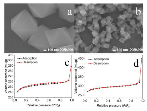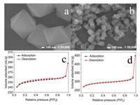 | Fig. 1. SEM images of UiO-66 (a) and CN/UiO-66-NH2 (b). The BET of UiO-66 (c) and CN/UiO-66-NH2 (d). | |