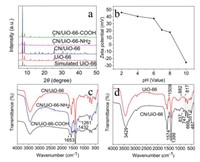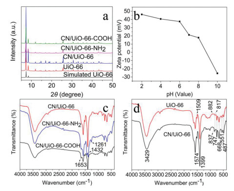 | Fig. 2. (a) Typical XRD patterns of UiO-66, CN/UiO-66, CN/UiO-66-NH2 and CN/UiO-66-COOH. (b) Zeta charge of CN/UiO-66-NH2 at different pH value. (c) FT-IR spectra of UiO-66 and CN/UiO-66 powders. (d) FT-IR spectra of CN/UiO-66, CN/UiO-66-NH2 and CN/UiO-66-COOH powders. | |