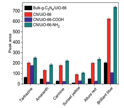 | Fig. 3. Comparison of the performance of bulk-g-C3N4/UiO-66, CN/UiO-66, CN/UiO-66-COOH, and CN/UiO-66-NH2 as sorbents of dSPE for extraction of food colorants. | |