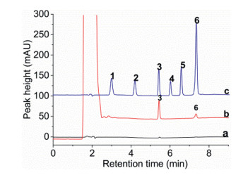 | Fig. 4. The chromatograms for the analysis of blueberry juice by HPLC-DAD, (a) direct injection of 1 µL blueberry juice, (b) pretreated by dSPE with CN/UiO-66-NH2 as sorbent, (c) standard solution with a concentration of 10 µg/mL. Peaks identification: (1) lemon yellow, (2) amaranth, (3) carmine, (4) sunset yellow, (5) alluring red, (6) brilliant blue. | |
