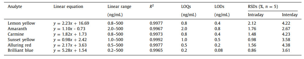 Table 1 The linear equation, linear range, correlation coefficients (R2), LOQs, LODs and precision of the developed dSPE-HPLC method for the analysis of food colorants. |