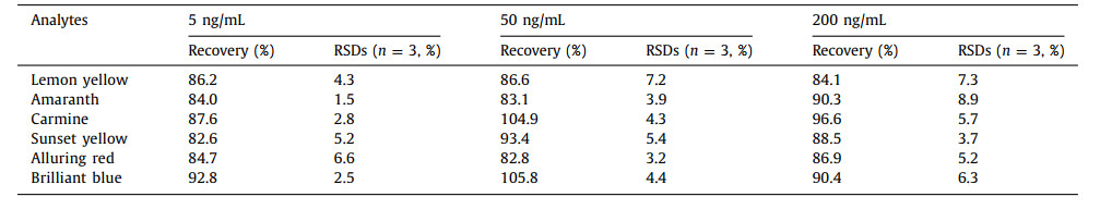 Table 2 The recoveries of method for the analysis of food colorants. |