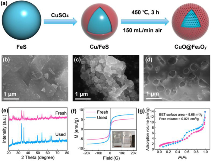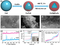 | Fig. 1. (a) Schematic illustration of the preparation process of CuO@FexOy. SEM images of (b) pristine FeS, (c) Cu/FeS, and (d) CuO@FexOy; (e) the XRD patterns and (f) the magnetic hysteresis loop, (g) N2 adsorption-desorption isotherms of CuO@FexOy. | |