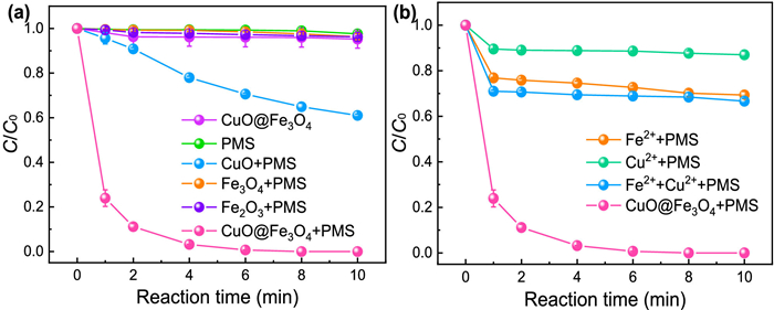 The SMX removal efficiencies in different systems are illustrated in Fig. 2a. It can be observed that negligible removal of SMX was performed in sole CuO@FexOy, sole PMS, Fe3O4/PMS and Fe2O3/PMS systems. While CuO can catalyze PMS to remove about 40% of SMX, surprisingly, CuO@FexOy performed highly efficient activation of PMS for the degradation of SMX. Completely SMX removal was achieved in the case of CuO@FexOy/PMS system. Fig. S2 (Supporting information) also shows that the kobs of CuO@FexOy/PMS system was 0.778 min−1, which was much higher than those of control systems. Besides, the leached concentrations of metal ions were also monitored in this process. The result illustrates that only 0.15 mg/L of iron ions and 1.21 mg/L of copper ions were leached in CuO@FexOy/PMS system, respectively. Therefore, the homogeneous catalytic reactions of metal ions were also determined by using the same concentration of leaching metal concentrations. It can be seen from Fig. 2b that the degradation efficiency of SMX by Fe2+/PMS is about 27%, which is higher than that of Cu2+/PMS system (about 10%). The removal rate of Fe2+/Cu2+/PMS system (about 30%) on SMX is only slightly higher than that of Cu2+/PMS. The above results indicated that heterogeneous CuO@FexOy performed highly efficient to activate PMS for SMX degradation.