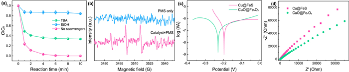| Fig. 3. (a) Effects of different radical scavengers for the SMX degradation in CuO@FexOy/PMS system at initial pH of 6.5. (b) ESR spectra in CuO@FexOy/PMS system with DMPO as the trapping agent. (c) Tafel polarization curves and (d) electrochemical impedance spectroscopic analysis of CuO@FexOy and Cu@FeS. Experiment conditions: [catalyst] = 0.3 g/L, [PMS]0= 0.3 mmol/L, [SMX]0= 5 mg/L, TBA = EtOH = 0.1 mol/L, solution pH 6.5. | |