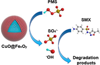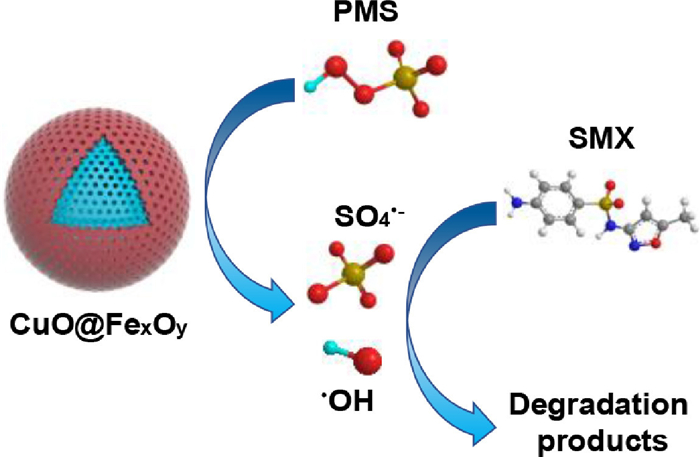 In summary, CuO@FexOy bimetallic oxides were fabricated by using chalcophilic natural mackinawite as the precursor. Various characterization methods prove that CuO was successfully coated on the surface of FexOy. It is also found that there were abundant mesoporous structures on the surface of catalyst, which further enhances the catalytic performance for PMS activation. CuO@FexOy has a much higher ability to activate PMS for the degradation of SMX. Scavenging experiments and ESR analysis indicated that both •OH and SO4•– contributed to the degradation of SMX, and SO4•– was the primary reactive species. Different types of emerging pollutants can be efficiently degraded by CuO@FexOy/PMS system. The excellent magnetic properties are conducive to the recycling of the catalyst and performed satisfactory reusability during long-term running.