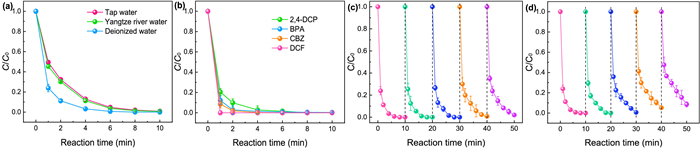 Additionally, SMX degradation efficiencies in different water bodies are depicted in Fig. 5a. A slight drop of degradation efficiency was observed in tap water and Yangtze River water. But SMX can be also completely removed within 10 min. In terms of the overall effect, the CuO@FexOy/PMS system showed excellent catalytic oxidation capacity in different water bodies. It can be seen from Fig. 5b that carbamazepine (CBZ), bisphenol A (BPA), 2, 4-dichlorophenol (2, 4-DCP) and diclofenac (DCF) can be completely removed within 8 min in CuO@FexOy/PMS system. Therefore, the CuO@FexOy/PMS process has great application prospects in the degradation of various emerging pollutants. Finally, five consecutive experiments of SMX degradation were conducted to evaluate the long-term efficiency of CuO@FexOy/PMS system. Fig. 5c shows the degradation efficiencies of SMX in five consecutive experiments by replacing the reactive solution of each cycle. The result indicated that CuO@FexOy/PMS system performed satisfactory reusability during long-term running (e.g., completely degradation of SMX was performed within 10 min after the fifth cycle). However, the degradation efficiencies of SMX gradually declined when remained the solution and only add 5 mg/L of SMX after each consecutive experiment (Fig. 5d) [32, 33]. The accumulation of degradation intermediates can consume the ROS during consecutive experiments, and then declined the removal rate of SMX in this circumstance. Anyway, the results of cyclic experiments demonstrated that CuO@FexOy/PMS system performed good activity for long-term running.