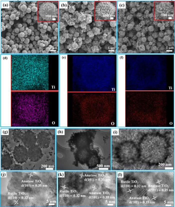 Fig. 2 shows the FESEM, EDS mapping and TEM images of the as-prepared WMTHMs-n samples. As shown in Fig. 2a, the WMTHMs-0 is composed of a large quantity of uniform, rough spheres with a diameter of around 0.95-1.10 µm. The high-resolution FESEM (inset of Fig. 2a) displays a waxberry-like TiO2 hollow sphere. Observingly, WMTHMs-0 consists of tiny short rods with dense state. With increasing the Fe content in the precursor, the diameter of WMTHMs-1 (Fig. 2b) increases to 1-1.30 µm, and the external structure of spheres has changed. The high-resolution FESEM (inset of Fig. 2b) displays the WMTHMs-1 is composed of nanorods with a diameter of about 70-80 nm, and the growth direction of these nanorods is nearly radially on the external surface of sphere. Moreover, the hollow interior is clearly observed from some broken spheres, which is favorable for enhancing the light scattering ability. With further increasing the Fe content in the precursor, as shown in Fig. 2c, WMTHMs-2 shows the same external structure as WMTHMs-1. WMTHMs-2 with a diameter of 1-1.20 µm is also composed of nanorods with a diameter of about 45-55 nm. The EDS mapping images (Figs. 2d-f) indicate that Ti and O elements are distributed homogeneously in three kinds of WMTHMs. The as-prepared WMTHMs-n samples are further characterized by TEM. In Fig. 2g, WMTHMs-0 consists of tiny nanorods and displays a hollow structure. In the case of little amount of FeCl3 added, WMTHMs-1 (Fig. 2h) and WMTHMs-2 (Fig. 2i) samples are composed of radially arranged nanorods and display a hollow structure. Ca2+ ions are exchanged with H+ ions in the presence of Na2EDTA. The out-diffusion rate of Ca2+ ions is much faster than the in-diffusion rate of H+ ions, which results in the formation of hollow structure [25]. TiO2 evolves from CaTiO3 by a dissolution-recrystallization process. Meanwhile, Fe-containing species are removed with the assistance of Na2EDTA. For WMTHMs-n, Figs. 2j-l demonstrate that the lattice spacings of 0.32 nm and 0.35 nm correspond to the (110) plane of rutile and the (101) plane of anatase TiO2, respectively.