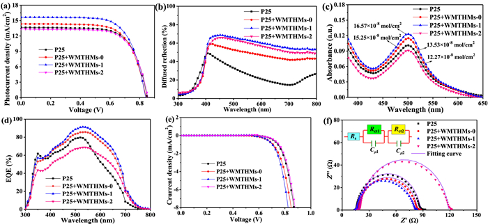 | Fig. 4. (a) J-V curves, (b) diffuse reflectance spectra, (c) UV-vis absorption spectra, (d) EQE spectra, (e) dark J-V and (f) EIS curves of DSSCs based on different photoanode films. | |