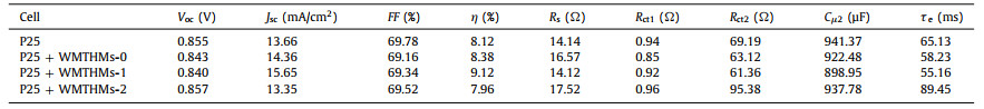 The dark J-V characteristics reflects the recombination of injected electrons with I3−. In Fig. 4e, the dark current densities of the Cell-P25 + WMTHMs-n are 4.09, 5.51 and 2.35 mA/cm2 at 0.80 V, respectively. On the contrary, the P25 + WMTHMs-2 electrode displays a low current density, indicating the low recombination loss. The relatively high dark current density of P25 + WMTHMs-1 electrode means a high interface recombination loss, which could be explained by the enlarged recombination. The high recombination loss leads to a decrease in Voc, which is agreement with the Voc value.