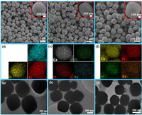 Fig. 1 shows the FESEM, EDS mapping and TEM images of the as-prepared CaTiO3-Fen precursors. As shown in Figs. 1a-c, the as-prepared CaTiO3-Fen precursors are nearly spherical structure in shape and their surfaces are rather smooth. The individual spheres are mutually separated without aggregation. As the amount of FeCl3 increases, the shape of the CaTiO3-Fen spheres is not changed, but the diameter of CaTiO3-Fen varies from 120 to 160 and 270 nm. The EDS mapping of CaTiO3-Fe0 (Fig. 1d) clearly reveals that the three elements (Ca, Ti, and O) are evenly distributed throughout the sample. The EDS mappings of CaTiO3-Fe1 (Fig. 1e) and CaTiO3-Fe2 (Fig. 1f) indicate that the four elements (Ca, Ti, O and Fe) are distributed over the entire samples. TEM results (Figs. 1g-i) confirm that all CaTiO3-Fen precursors display a solid structure.