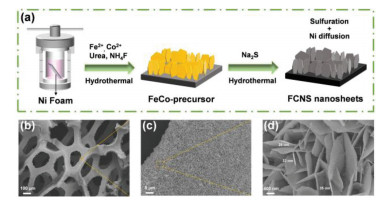 | Fig. 1. (a) Schematic illustration of the synthesis process of FCNS@NF. (b–d) SEM images of FCNS@NF at different scales. | |