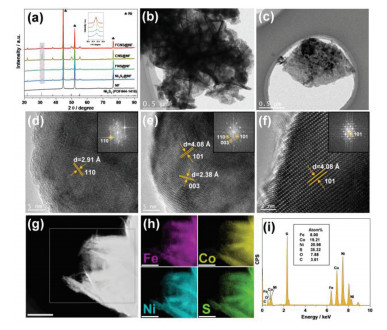 | Fig. 2. (a) XRD patterns of the Ni foam and as-prepared electrodes. Inset shows the specific XRD patterns of the selected region. (b, c) TEM images, (d-f) HRTEM images, (g, h) HAADF-STEM image and corresponding elements mapping, and (i) EDS spectrum of FCNS@NF. The scale bar in (g, h) is 500 nm. | |