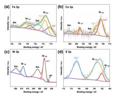 | Fig. 3. XPS spectra of (a) Fe 2p, (b) Co 2p, (c) Ni 2p and (d) S 2p for FCNS@NF. | |
