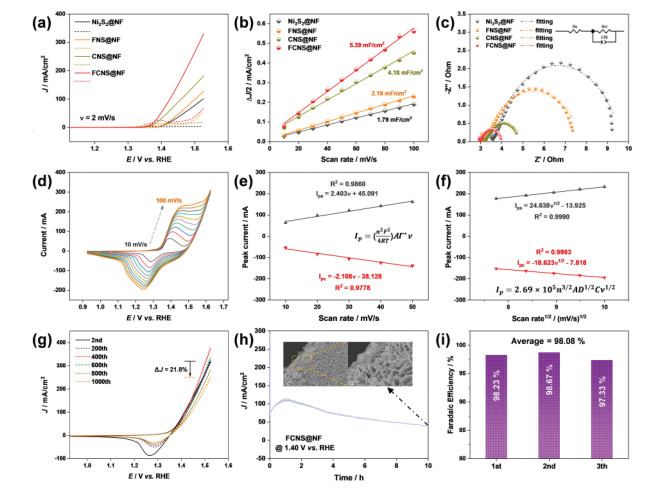 | Fig. 4. (a) LSVs in a 1.0 mol/L KOH solution with (solid line) and without (dotted line) 1.0 mol/L methanol at 2 mV/s. (b) Linear fitting of current density difference (Δj/2) vs. the scan rate. (c) Nyquist plots of PEIS for Ni3S2@NF, FNS@NF, CNS@NF and FCNS@NF. inset: equivalent circuit. (d) CVs in a 1.0 mol/L KOH solution at different scan rates (10–100 mV/s). (e) Linear fitting of the anodic and cathodic peak current with the scan rate in the low scan rate range (10–50 mV/s). (f) Linear fitting of the anodic and cathodic peak current densities with the square roots of the scan rate in the higher scan rate range (60–100 mV/s). (g) CVs with different cycles at 50 mV/s in the ADT. (h) CA curve at 1.40 V, inset: SEM images of the catalyst after CA test. (i) Calculated faradaic efficiency of methanol-to-formate conversion with three independent tests after 10 h CA test for FCNS@NF in a 1.0 mol/L KOH solution containing 1.0 mol/L methanol. | |