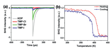 | Fig. 7. (a) Oscilloscope traces of SHG signals for TMP-Cl, TMP-Br, TMP-I and KDP at the room temperature. (b) The SHG curves of TMP-Br at variable temperature. | |