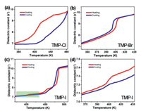 | Fig. 2. Temperature-dependent real part (ε´) of the dielectric constant measured at 1 MHz for (a) TMP-Cl, (b) TMP-Br, (c) TMP-I and (d) the partially enlarged curves of TMP-I at 1 MHz. | |