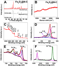 | Fig. 2. (A) XRD pattern of Fe2O3@N-C. (B) Raman spectrum of Fe2O3@N-C. (C) The survey, (D) C 1s, (E) Fe 2p and (F) Zn 2p spectra of Fe2O3@N-C. | |