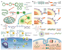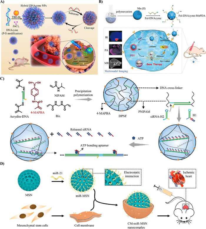 | Fig. 3. Delivery of nucleic acid reagents via DNA-based nanomaterials. (A) Carrier-free DNA hybrid nanomaterials the cellular efficiency of DNAzyme. Reproduced with permission [40]. Copyright 2021, the American Chemical Society. (B) Polydopamine-Mn2+ nanoparticle (Mn-PDA) improves the cellular efficiency of DNAzyme. Reproduced with permission [41]. Copyright 2018, the American Chemical Society. (C) DNA polymer nanocarrier improves the stability of siRNA. Reproduced with permission [45]. Copyright 2021, Nature Publishing Group. (D) CM-miR-MSN improves the stability of miRNA. Reproduced with permission [46]. Copyright 2020, Elsevier Ltd. | |