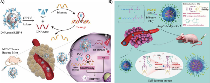 | Fig. 4. DNA-based nanomaterials achieve drug release by pH and ROS response. (A) The Ce6-DNAzyme is released by pH. Reproduced with permission [52]. Copyright 2019, Wiley Publishing Group. (B) The 3I-NM@siRNA is released by ROS. Reproduced with permission [56]. Copyright 2018, Wiley Publishing Group. | |