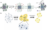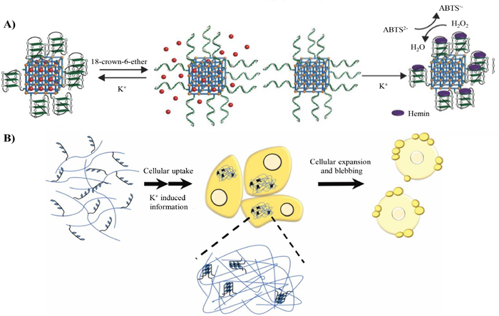 | Fig. 5. DNA-based nanomaterials achieve drug release and self-assembly. (A) G-quadruplex as gating unit in response to K+ to release rhodamine 6 G. Reproduced with permission [57]. Copyright 2016, Wiley Publishing Group. (B) G-quadruplex as crossing-linker to promote self-assembly of the materials. Reproduced with permission [58]. Copyright 2018, the American Chemical Society. | |