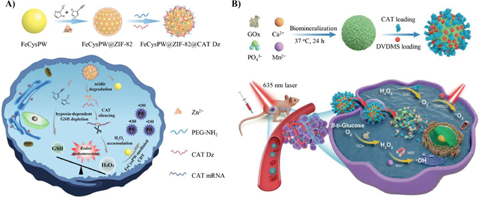 The effect of chemodynamic therapy is also easily limited by low intracellular H2O2 content. GOx can catalyze the conversion of glucose into H2O2 in the tumor to enhance the effect of chemodynamic therapy [73]. Huang and his co-workers developed a biodegradable O2 self-supplying nanoplatform (GMCD), which enhanced the effect of PDT in tumor treatment by activating cascade catalytic reaction (Fig. 7B) [74]. CAT in GMCD effectively promoted the decomposition of endogenous H2O2 into O2, attenuating the hypoxia environment in tumor site and supplied the O2 consumption for GOx catalysis, thus accelerating the decomposition of glucose in tumor. In addition, the produced O2 also enhanced the 1O2 production of DVDMS under light irradiation to enhance the efficacy of PDT. Meanwhile, the Fenton reaction mediated by Mn2+ transformed the H2O2 produced by GOx into the highly toxic ·OH, which amplified the oxidative damage of ROS to cancer cells and enhanced the therapeutic effect. Therefore, the above-mentioned GMCD, which enhanced the PDT effect through cascade reaction, realized O2 self-supply, and TME activation degradation process significantly inhibited tumor growth and achieved dual-imaging.