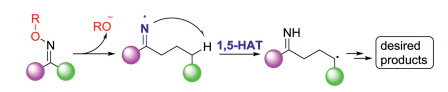 Iminyl radical is one of the main types of nitrogen radicals, due to the existence of C(sp2)–N bonds and it belongs to the σ−type free radical, both electrophilicity and nucleophilicity existed in its molecule [1, 2]. Because the weak N−O bond (BDE ≈ 50 kcal/mol) are easily cleavage, oxime derivatives become one of the excellent precursors for the production of iminyl radicals. Iminyl radical derived from oxime derivatives could mediated various reactions. At present, these iminyl radical induced reactions can be divided to four main reaction modes: (1) addition reaction to aromatics; (2) intramolecular hydrogen atom transfer (HAT) and subsequent reactions; (3) addition reactions to olefins; (4) norrish−I type cleavage (C−C bond cleavage at α position) and subsequent reactions. The bond−dissociation energy (BDE) of iminyl N−H (93 kcal/mol) is lower than most of the aliphatic C(sp3)−H (96−105 kcal/mol), rendering the 1, 5−HAT of iminyl radical to carbon radical thermodynamically unfavourable. Therefore 1, 5−HAT of the iminyl radical is challenged and far less developed compared with other iminyl radical induced reactions. In this review, recent advances in C(sp3)−H bond functionalization of oximes derivatives via iminyl radical induced 1, 5−hydrogen atom transfer (HAT) will be summarized (Fig 1). According to the different type of products, this review was divided into three parts: (1) C(sp3)−H bond functionalization for C−C bond formation. (2) C(sp3)−H bond functionalization for C−N bond formation. (3) C(sp3)−H bond functionalization for C−S, C−F bond formation.