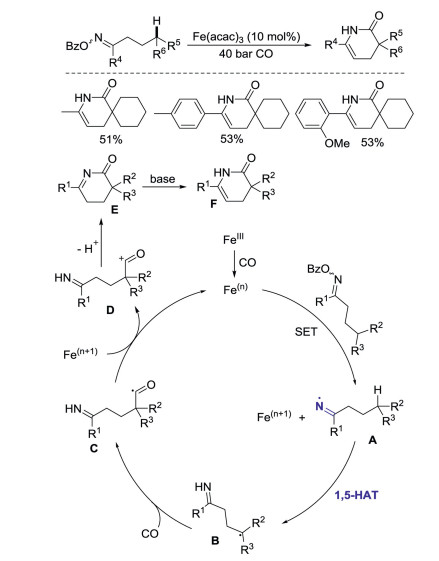 Because of its steric hindrance and easily to be oxidized, carbonylation of tertiary carbon radicals are challeging. Wu group found that CO was good substrate to react with oxime esters for the synthesis of cyclic compounds via carbonylation of tertiary carbon radicals (Scheme 10) [28]. Various six−membered lactams were obtained in high yields and excellent chemo−selectivities in the presence of Fe(acac)3 as catalyst. Oximes with secondary C(sp3)-H bond also suitable for this reaction, but product with a slight lower yield was obtained. A SET reduction of oxime esters by Fen species to give the iminyl radical A, 1, 5−hydrogen atom transfer induced by iminyl radical to give tertiary carbon radical B, capture of CO gas to form the intermediate C, single-electron oxidation of radical C to form acyl carbocation intermediate D by Fen+1 species, were described in the potential mechanism.
