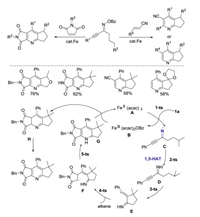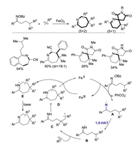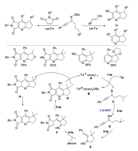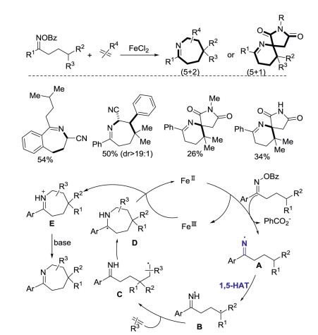 By integration of 1, 5-hydrogen atom transfer trigged by iminyl radical and [5 + 2] or [5 + 1] annulation processes [23], a series of structurally novel and interesting azepine and spirotetrahydropyridine derivatives with moderate to high yields were successfully prepared in the presence of FeCl2 as catalyst (Scheme 5). Note that, when an oxime bears two potentially reactive sites for 1, 5-HAT, the reaction preferred to occur at the methyl group, probably due to the relatively high stability of the benzylic carbon radical. Various electron-deficient alkenes were well applied to this reaction, but alkenes such as styrene and methyl cinnamate did not give the desired products. When maleimides were applied to this transformation, the [5 + 1] annulation products, spiro-succinimide-tetrahydropyridine derivatives were isolated. N-Aryl maleimides, N−Me maleimide and NH−maleimide are all well tolerated in this reaction. Mechanism investigation supported the involvement of a γ−carbon radical in the annulation reaction. Firstly, reductive generation of iminyl radical via SET between FeⅡ and oxime occured. The iminyl radical undergoes 1, 5−HAT to form an alkyl carbon radical B, which followed by the addition of the γ−carbon radical to the alkene to give a new carbon radical C. Then intermediate D which was form from the intramolecular addition of carbon radical to the imine group, was oxidized by the FeⅢ to afford an iminium ion E with the release of the FeⅡ catalyst. Finally, the desired product azeping derivative would be generated via deprotonation.