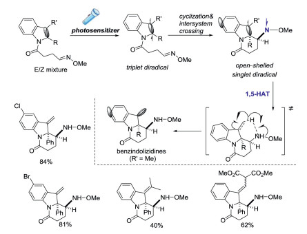 Visible−light−induced dearomatization reaction for the synthesis of highly strained polycyclic molecules has gained much attention in recent years [35-39]. Transient, high−energy diradical species as key intermediates are typically involved in this type of reaction. In 2020, You group described the visible-light-induced divergent dearomatization of indole-tethered O-methyl oximes for the synthesis of indoline-fused azetidines [40], in which the reactions of the open-shelled singlet diradical intermediates toward 1, 5-hydrogen atom transfer was involved when alkyl substituent was available at the C3 position of the indole ring (Scheme 12). A series of experimental and computational investigations were conducted to explain the mechanism. It was interesting to note that when substrates bearing none substituent at the C3 position of the indole ring, the [2 + 2] cycloadditions occurred to form related polycyclic molecules.