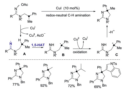 In 2014, Chiba group described the CuI−catalyzed redox neutral C(sp3)–H amination reactions of readily available N-alkylamidoximes (Scheme 13) [41]. Dihydroimidazoles with moderate yields could be isolated. The reaction is initiated by reduction of the oxime N–O bond with Cu(Ⅰ) species, providing iminyl radicals A and Cu(Ⅱ) species. After the 1, 5−H shift, the carbocation C was formed via oxidation of C−radicals B by the Cu(Ⅱ). Finally, dihydroimidazole products were generated via amination and deprotonation reaction. In addition, the reactions of N-benzoylamidoximes resulted in C(sp2)–H amination to form quinazolinones was also possible.